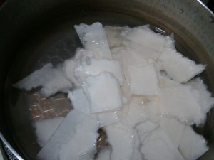 まずは、牛乳パックを鍋に入るくらいに切って、一煮立ち。グツグツ。